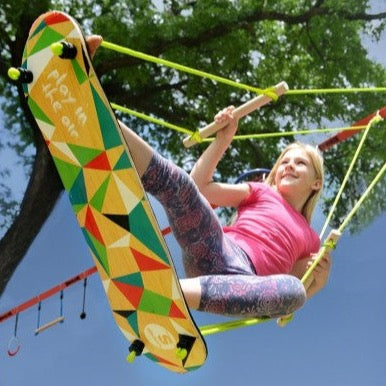 Hop on to the Skate Swing, and play in the air! Part skateboard and part swing, this ride takes play to new heights. The bright wooden prism design and non-slip foam top make this toy safe and eye catching, but that’s not why you would want this swing. This Skate Swing makes a fun, high-flying addition to the Ninjaline®. Attach the Skate Swing to the line, take necessary precautions and you're ready to begin.
